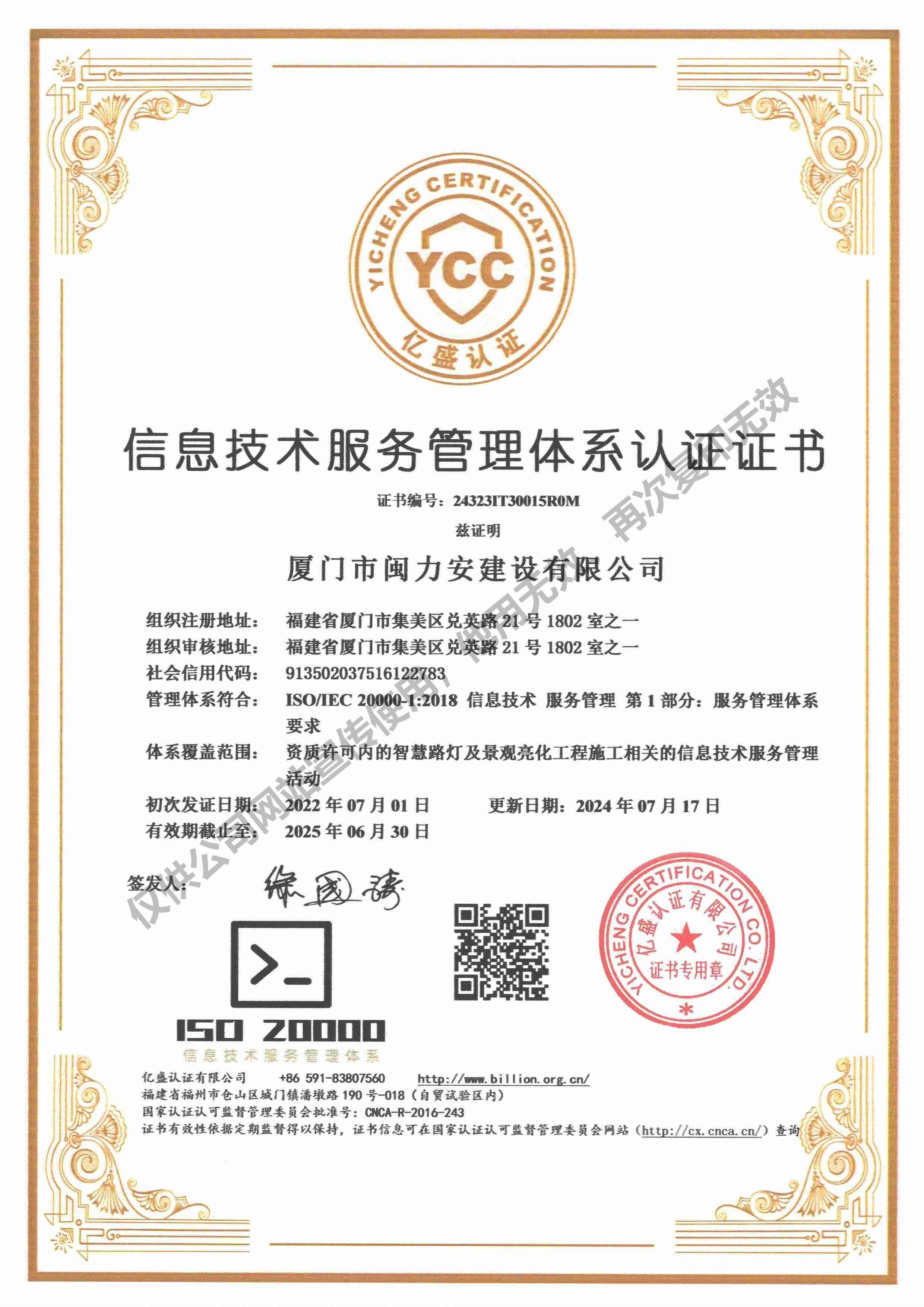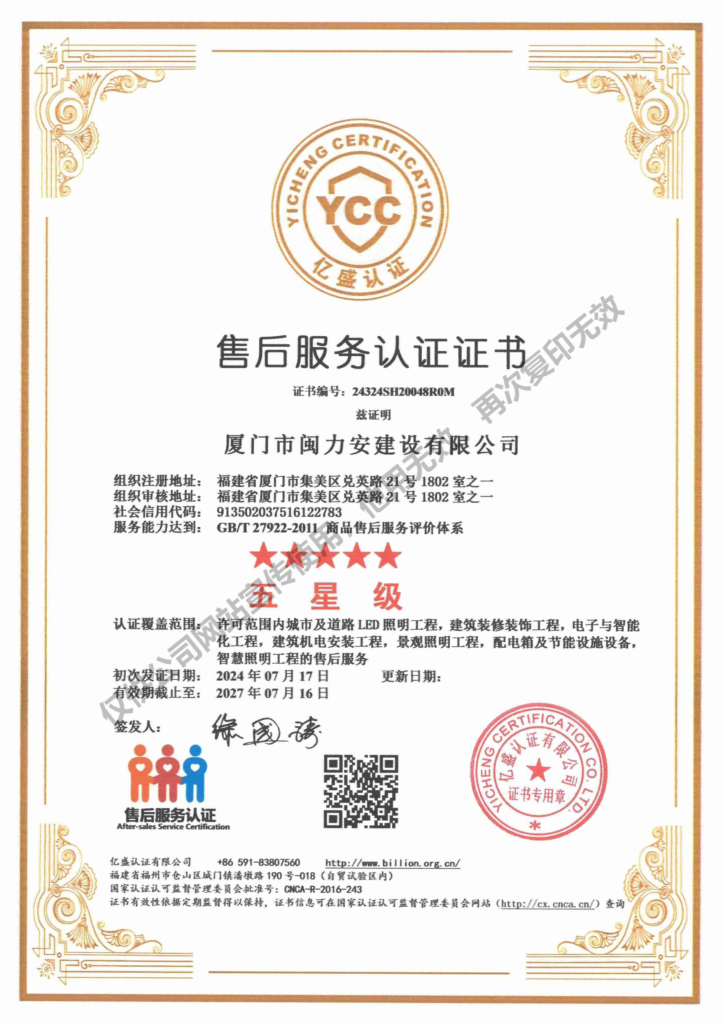 廈門市閩力安建設(shè)有限公司成立于2003年,公司取得市政公用工程施工總承包貳級、建筑裝修裝飾工程專業(yè)承包壹級、城市及道路照明工程專業(yè)承包壹級、電子與智能化工程專業(yè)承包貳級、消防設(shè)施工程專業(yè)承包貳級、電力工程施工總承包叁級、建筑機電安裝工程專業(yè)承包叁級、輸變電工程專業(yè)承包叁級、環(huán)保工程專業(yè)承包叁級、照明工程設(shè)計專項甲級、建筑裝飾工程設(shè)計乙級、施工勞務(wù)等資質(zhì)的綜合型企業(yè),公司于2013年通過了ISO9001質(zhì)量體系認證,ISO14001環(huán)境管理體系認證,OHSAS18001職業(yè)健康安全管理體系認證。